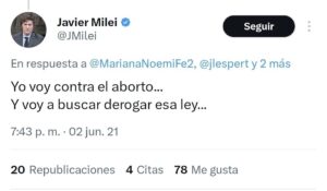 Tuit de Milei hablando de la derogación del aborto: